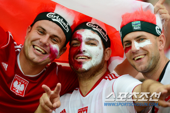 9일(한국시각) 폴란드 바르샤바 국립경기장에서 유로 2012 개막전 폴란드와 그리스의 경기가 열렸다. 경기전 개막행사에서 독특한 의상을 입은 여성들이 그라운드를 수놓고 있다. 페이스 페인팅을 한 폴란드 관중이 활짝 웃고 있다.