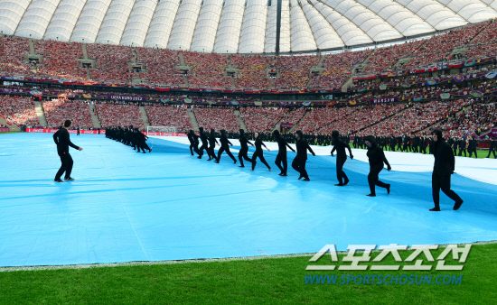 9일(한국시각) 폴란드 바르샤바 국립경기장에서 유로 2012 개막전 폴란드와 그리스의 경기가 열렸다. 경기전 개막행사에서 독특한 의상을 입은 여성들이 그라운드를 수놓고 있다. 경기전 열린 개막행사에서 멋진 공연이 펼쳐지고 있다. 공연에 펼친 인원들이 그라운드를 덮었던 천을 일사분란하게 걷고 있다.