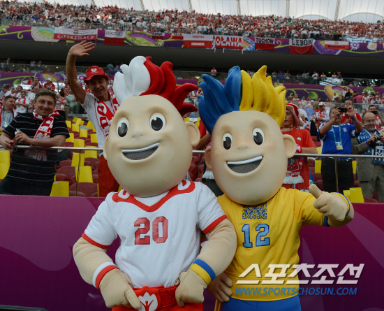 9일(한국시각) 폴란드 바르샤바 국립경기장에서 유로 2012 개막전 폴란드와 그리스의 경기가 열렸다. 유로 2012 마스코트인 슬라벡, 슬라브코가 포즈를 취하고 있다.