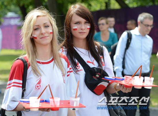 9일 오전 1시 (한국시각) 유로 2012 개막전 폴란드와 그리스의 경기를 앞두고 폴란드 바르샤바 국립 경기장에는 아침 일찍부터 폴란드를 응원하는 국민들로 북적였다. 경기장 앞에서 페이스페인팅을 하는 미녀들이 물감이 든 팔레트를 들고 있다.
