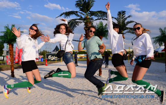 10일(한국시각) 우크라이나에서 유로 2012 독일과 포르투갈의 경기가 한창인 가운데 공동개최국 폴란드 그단스크에 마련된 칼스버그 팬캠프에서 대학생 자원봉사자들이 취재진의 사진촬영 요청에 멋진 점프 포즈로 답하고 있다. 그런데 이 모습을 지켜보던 한 남성 캠핑족이 달려와 함께 뛰어오르며 조화로운(?) 장면을 만들어내고 있다. 그단스크(폴란드)=정재근 기자 cjg@sportschosun.com