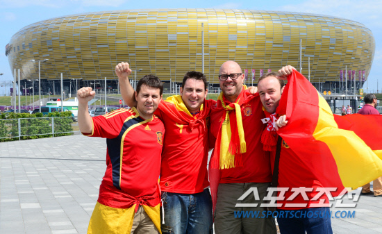 11일(한국시각) 오전 1시 폴란드 그단스크 아레나에서 열리는 유로 2012 스페인과 이탈리아의 경기를 앞두고 스페인에서 원정응원을 온 팬들이 경기장 앞에서 포즈를 취하고 있다.