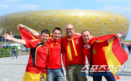 11일(한국시각) 오전 1시 폴란드 그단스크 아레나에서 열리는 유로 2012 스페인과 이탈리아의 경기를 앞두고 스페인에서 원정응원을 온 팬들이 경기장 앞에서 포즈를 취하고 있다.
