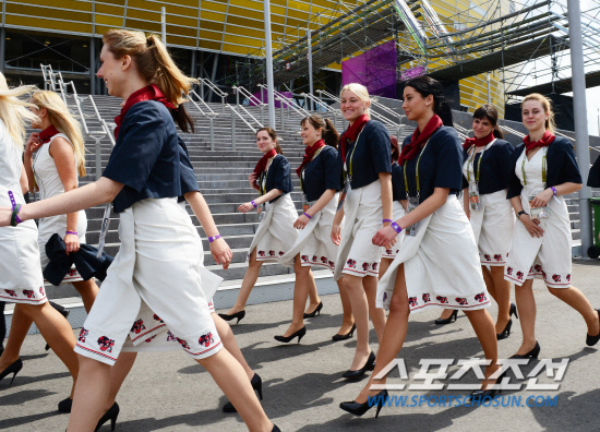 11일(한국시각) 오전 1시 폴란드 그단스크 아레나에서 열리는 유로 2012 스페인과 이탈리아의 경기를 앞두고 유니폼을 차려입은 여성 경기진행요원들이 바쁘게 이동하고 있다.