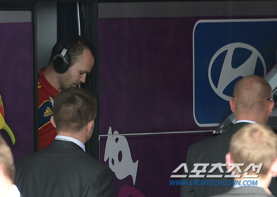 11일(한국시각) 오전 1시 폴란드 그단스크 아레나에서 열리는 유로 2012 스페인과 이탈리아의 경기를 앞두고 경기장에 도착한 스페인 이니에스타가 버스에서 내리고 있다.
