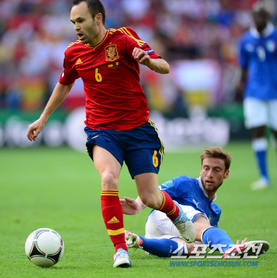 11일(한국시각) 오전 1시 폴란드 그단스크 아레나에서 열리는 유로 2012 스페인과 이탈리아의 경기가 열렸다. 스페인 이니에스타가 이탈리아 마르키시오의 태클을 피하며 돌진하고 있다.