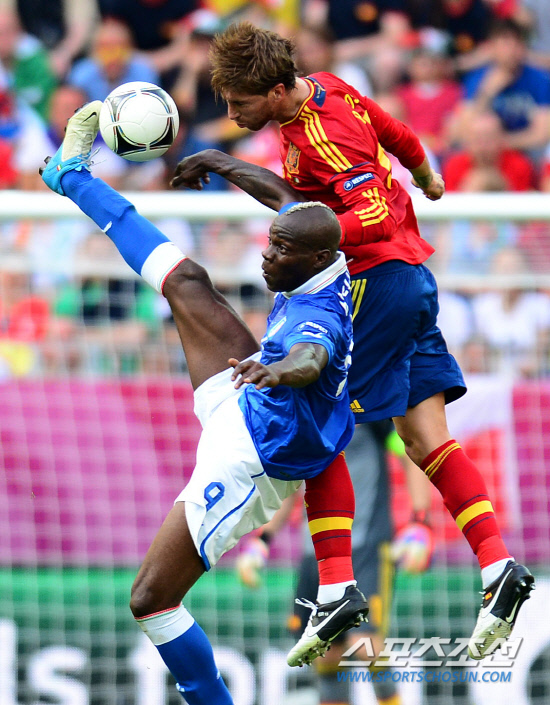 11일(한국시각) 오전 1시 폴란드 그단스크 아레나에서 열리는 유로 2012 스페인과 이탈리아의 경기가 열렸다. 스페인 바르찰리와 이태리 바르우아가 공을 사이에 두고 머리와 발로 맞서고 있다.