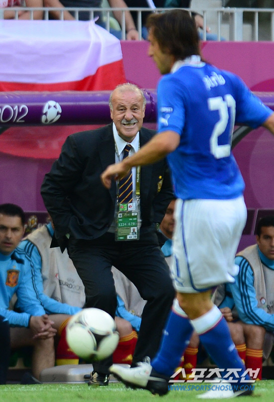 11일(한국시각) 오전 1시 폴란드 그단스크 아레나에서 열리는 유로 2012 스페인과 이탈리아의 경기가 열렸다. 스페인 델 보스케 감독이 이탈리아 피를로가 공을 잡자 안절부절 못하고 있다.
