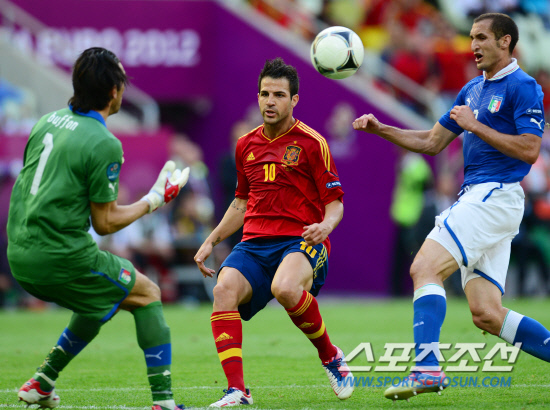 11일(한국시각) 오전 1시 폴란드 그단스크 아레나에서 열리는 유로 2012 스페인과 이탈리아의 경기가 열렸다. 스페인 파브레가스가 골문으로 돌진했지만 부폰이 달려나오자 멈칫하고 있다.