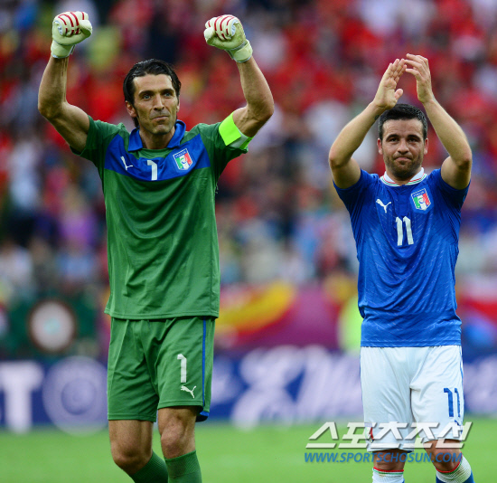 11일(한국시각) 오전 1시 폴란드 그단스크 아레나에서 열리는 유로 2012 스페인과 이탈리아의 경기가 열렸다. 1-1로 무승부로 경기를 끝낸 이탈리아 부폰 골키퍼와 골을 넣은 나탈레가 팬들을 향해 인사하고 있다.