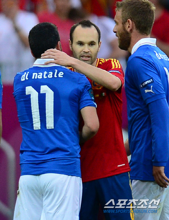 11일(한국시각) 오전 1시 폴란드 그단스크 아레나에서 열리는 유로 2012 스페인과 이탈리아의 경기가 열렸다. 1-1 무승부로 경기를 끝낸 스페인 이니에스타가 이탈리아 나탈레와 포옹을 하고 있다.