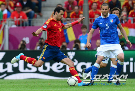 11일(한국시각) 오전 1시 폴란드 그단스크 아레나에서 열리는 유로 2012 스페인과 이탈리아의 경기가 열렸다. 스페인 부스케츠가 모타의 수비를 피해 슈팅을 시도하고 있다.