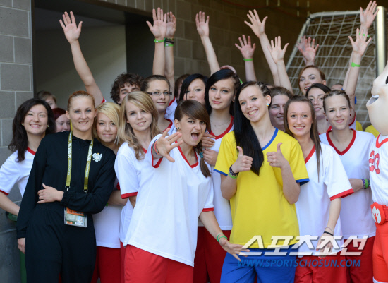 11일(한국시각) 오전 1시 폴란드 그단스크 아레나에서 열리는 유로 2012 스페인과 이탈리아의 경기를 앞두고 식전행사를 준비하는 학생들이 카메라를 보며 깜찍한 포즈를 취하고 있다.