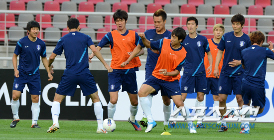 레바논과의 2014년 브라질월드컵 아시아지역 최종예선 2차전을 하루 앞둔 최강희호가 11일 고양종합운동장에서 훈련을 가졌다. 선수들이 즐거운 분위기 속에서 패스게임을 하고 있다. 고양=허상욱 기자 wook@sportschosun.com/2012.06.11/