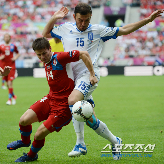 체코가 그리스를 2-1로 꺾고 조별예선경기에서 1패후 1승을 거뒀다.13일(한국시각) 유로 2012 그리스와 체코의 경기가 폴란드 브로츠와프 시립경기장에서 열렸다. 체코 필라르가 그리스 토로시디스와 치열한 공다툼을 벌이고 있다.