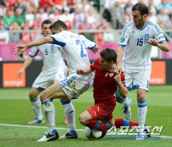 체코가 그리스를 2-1로 꺾고 조별예선경기에서 1패후 1승을 거뒀다.13일(한국시각) 유로 2012 그리스와 체코의 경기가 폴란드 브로츠와프 시립경기장에서 열렸다. 전반 6분 체코 필라르가 그리스 골키퍼 칼키아스가 놓친 공을 수비수 사이로 달려들어 슈팅을 시도해 골을 성공시키고 있다.
