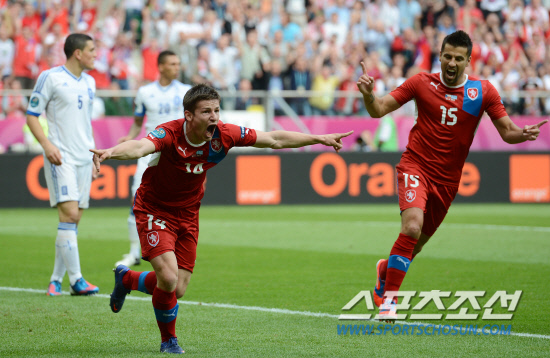 체코가 그리스를 2-1로 꺾고 조별예선경기에서 1패후 1승을 거뒀다.13일(한국시각) 유로 2012 그리스와 체코의 경기가 폴란드 브로츠와프 시립경기장에서 열렸다. 체코 필라르가 두번 째 골을 성공시킨 후 환호하고 있다.
