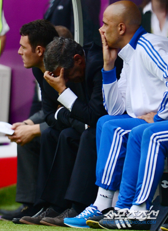 체코가 그리스를 2-1로 꺾고 조별예선경기에서 1패후 1승을 거뒀다.13일(한국시각) 유로 2012 그리스와 체코의 경기가 폴란드 브로츠와프 시립경기장에서 열렸다. 경기 초반 두 골을 허용한 그리스의 산투스 감독이 고개를 숙이며 고뇌하고 있다.