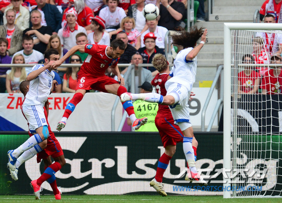 체코가 그리스를 2-1로 꺾고 조별예선경기에서 1패후 1승을 거뒀다.13일(한국시각) 유로 2012 그리스와 체코의 경기가 폴란드 브로츠와프 시립경기장에서 열렸다. 체고 문전에서 치열한 공중볼 다툼이 벌어지고 있다.