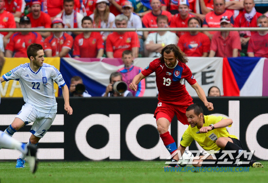 체코가 그리스를 2-1로 꺾고 조별예선경기에서 1패후 1승을 거뒀다.13일(한국시각) 유로 2012 그리스와 체코의 경기가 폴란드 브로츠와프 시립경기장에서 열렸다. 체코 이라체크가 공을 잡는 순간 주심이 넘어지고 있다.