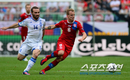 체코가 그리스를 2-1로 꺾고 조별예선경기에서 1패후 1승을 거뒀다.13일(한국시각) 유로 2012 그리스와 체코의 경기가 폴란드 브로츠와프 시립경기장에서 열렸다. 체코 림베르스키와 그리스 살핀기디스가 치열한 공다툼을 벌이고 있다.