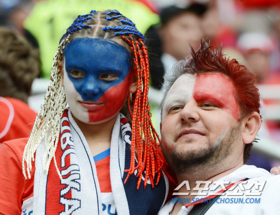 체코가 그리스를 2-1로 꺾고 조별예선경기에서 1패후 1승을 거뒀다.13일(한국시각) 유로 2012 그리스와 체코의 경기가 폴란드 브로츠와프 시립경기장에서 열렸다. 체코에서 원정 응원을 온 부녀가 얼굴에 페이스페인팅을 하고 포즈를 취하고 있다.