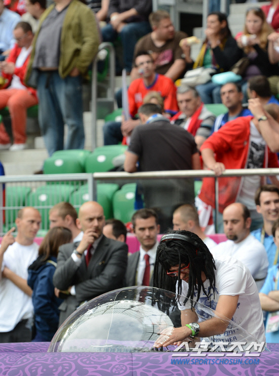 체코가 그리스를 2-1로 꺾고 조별예선경기에서 1패후 1승을 거뒀다.13일(한국시각) 유로 2012 그리스와 체코의 경기가 폴란드 브로츠와프 시립경기장에서 열렸다. 경기 시작전 그라운드에서 디스크자키가 음악을 틀고 있다.