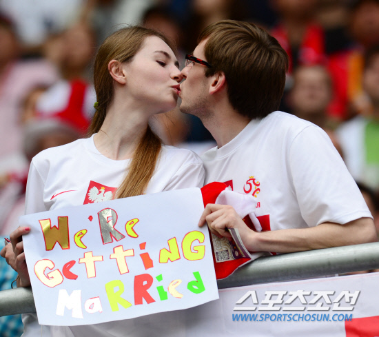 체코가 그리스를 2-1로 꺾고 조별예선경기에서 1패후 1승을 거뒀다.13일(한국시각) 유로 2012 그리스와 체코의 경기가 폴란드 브로츠와프 시립경기장에서 열렸다. 경기가 체코의 승리로 끝난 후 한 체코 커플이 '우리 결혼해요!'라는 문장이 적힌 종이를 든 채 키스를 하고 있다.