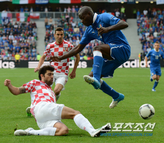 15일(한국시각) 유로 2012 C조 예선 2차전 이탈리아와 크로아티아의 경기가 폴란드 포즈난 시립경기장에서 열렸다. 이탈리아 발로텔리가 크로아티아 촐루카의 태클을 피하고 있다.