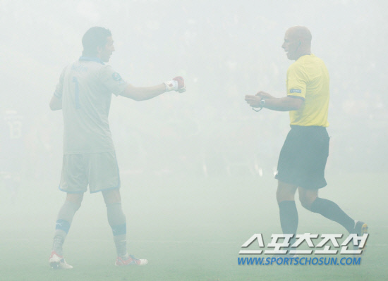 15일(한국시각) 유로 2012 C조 예선 2차전 이탈리아와 크로아티아의 경기가 폴란드 포즈난 시립경기장에서 열렸다. 크로아티아가 만주키치의 골로 1-1 동점을 만들자 또다시 흥분한 크로아티아 관중석에서 불꽃이 그라운드로 날아들었다. 연기가 자욱한 가운데 이탈리아 부폰 골키퍼가 심판과 이야기를 나누고 있다.