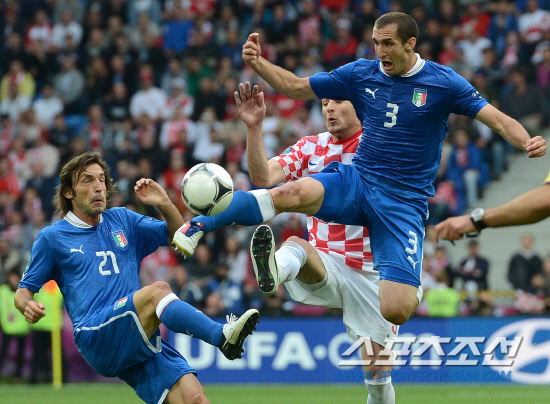 이탈리아가 천적 크로아티아와 1-1 무승부를 기록했다.15일(한국시각) 유로 2012 C조 예선 2차전 이탈리아와 크로아티아의 경기가 폴란드 포즈난 시립경기장에서 열렸다. 이탈리아는 전반 39분 피를로의 프리킥으로 선제골을 넣었지만 후반 37분 크로아티아 만주키치에게 통한의 동점골을 허용했다. 이탈리아 키엘리니, 피를로와 크로아티아 옐라비치가 발을 들어 공다툼을 벌이고 있다.
