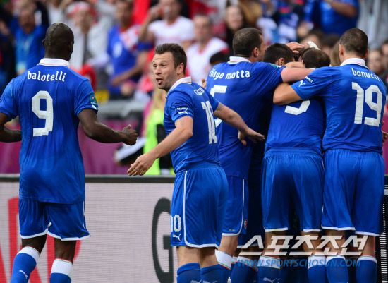 이탈리아가 천적 크로아티아와 1-1 무승부를 기록했다.15일(한국시각) 유로 2012 C조 예선 2차전 이탈리아와 크로아티아의 경기가 폴란드 포즈난 시립경기장에서 열렸다. 이탈리아는 전반 39분 피를로의 프리킥으로 선제골을 넣었지만 후반 37분 크로아티아 만주키치에게 통한의 동점골을 허용했다. 이탈리아 피를로가 선제골을 넣자 동료들이 축하하러 달려가고 있다.