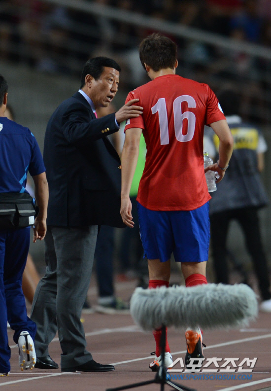 브라질 월드컵 최종예선 2차전 대한민국과 레바논의 경기가 12일 고양종합운동장에서 펼쳐졌다. 경기 초반 기성용이 교체되며 최강희 감독과 이야기하고 있다. 고양=전준엽 기자 noodle@sportschosun.com