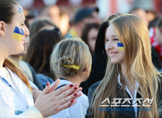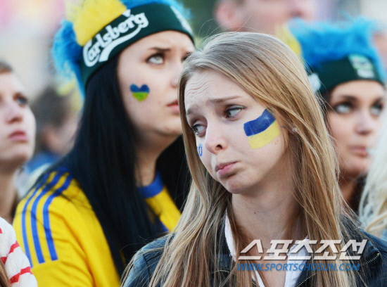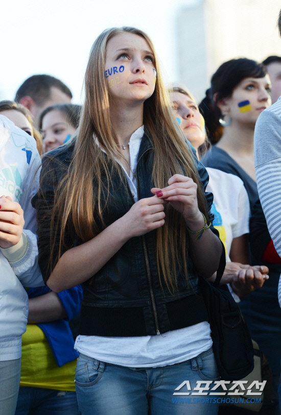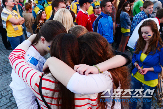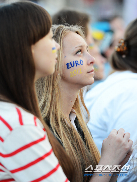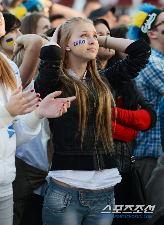 16일(한국시각) 유로2012 D조 2차전 우크라이나와 프랑스의 경기가 우크라이나 도네츠크 돈바스 아레나에서 열렸다. 공동개최국인 폴란드 바르샤바 중심가 광장에 마련된 팬존에는 우크라이나와 프랑스 국민들이 대형 전광판을 통해 중계되는 경기를 보기 위해 모였다. 특히 우크라이나에서 바르샤바로 유학을 온 많은 여학생들이 광장을 찾았다. 대학생 특유의 생기발랄한 모습으로 경기가 시작되기만을 기다리던 여학생들은 후반전 우크라이나가 프랑스에게 연달아 두 골을 허용하자 눈물을 글썽이기 시작했다. 바르샤바(폴란드) =정재근 기자 cjg@sportschosun.com