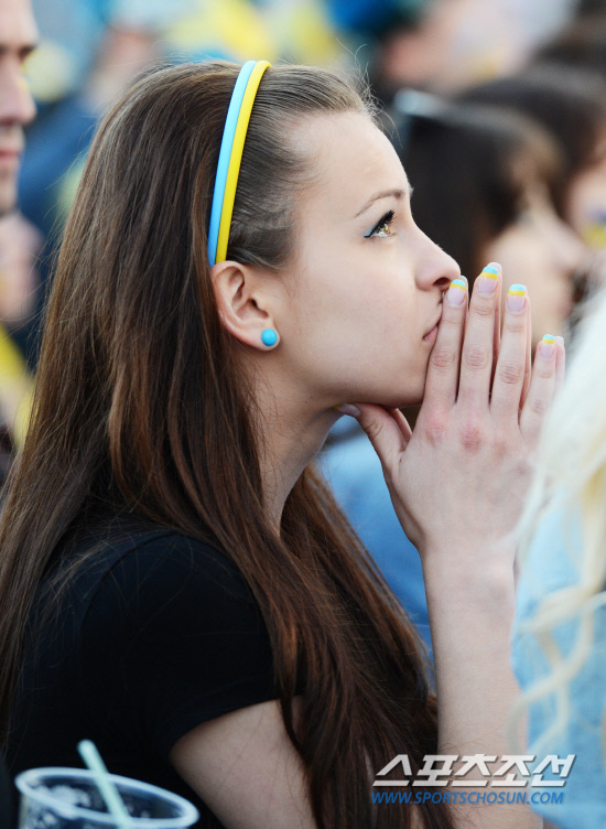 16일(한국시각) 유로2012 D조 2차전 우크라이나와 프랑스의 경기가 우크라이나 도네츠크 돈바스 아레나에서 열렸다. 공동개최국인 폴란드 바르샤바 중심가 광장에 마련된 팬존에는 우크라이나와 프랑스 국민들이 대형 전광판을 통해 중계되는 경기를 보기 위해 모였다. 우크라이나에서 바르샤바에 있는 대학교로 유학을 온 여학생이 간절한 표정으로 경기를 지켜보고 있다. 바르샤바(폴란드) =정재근 기자 cjg@sportschosun.com