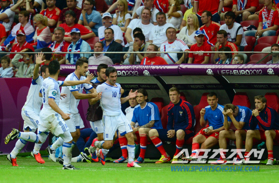 러시아와 그리스의 유로 2012 A조 조별예선 마지막 경기가 17일(한국시각) 폴란드 바르샤바 국립경기장에서 열렸다. 그리스 카라구니스가 전반 막판 선제골을 넣고 러시아 벤치 앞에서 동료들과 환호하고 있다.