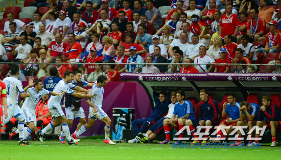 러시아와 그리스의 유로 2012 A조 조별예선 마지막 경기가 17일(한국시각) 폴란드 바르샤바 국립경기장에서 열렸다. 그리스 카라구니스가 전반 막판 선제골을 넣고 러시아 벤치 앞으로 달려가며 동료들과 환호하고 있다.