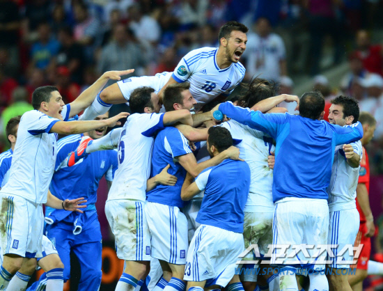그리스가 러시아를 꺾고 극적으로 8강에 진출했다. 러시아와 그리스의 유로 2012 A조 조별예선 마지막 경기가 17일(한국시각) 폴란드 바르샤바 국립경기장에서 열렸다. 1-0으로 승리를 거둔 그리스 선수들이 환호하고 있다.