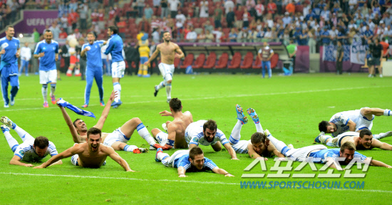 그리스가 러시아를 꺾고 극적으로 8강에 진출했다. 러시아와 그리스의 유로 2012 A조 조별예선 마지막 경기가 17일(한국시각) 폴란드 바르샤바 국립경기장에서 열렸다. 1-0으로 승리를 거두며 극적으로 8강에 진출한 그리스가 그라운드를 슬라이딩하며 기쁨을 만끽하고 있다.