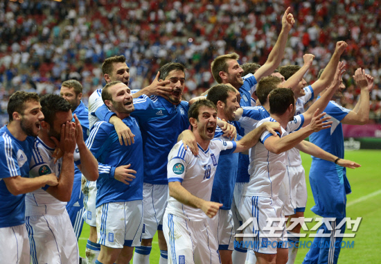 그리스가 러시아를 꺾고 극적으로 8강에 진출했다. 러시아와 그리스의 유로 2012 A조 조별예선 마지막 경기가 17일(한국시각) 폴란드 바르샤바 국립경기장에서 열렸다. 1-0으로 승리를 거두며 극적으로 8강에 진출한 그리스 선수들이 팬들과 함께 기쁨을 만끽하고 있다.