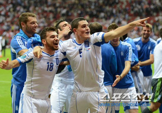 그리스가 러시아를 꺾고 극적으로 8강에 진출했다. 러시아와 그리스의 유로 2012 A조 조별예선 마지막 경기가 17일(한국시각) 폴란드 바르샤바 국립경기장에서 열렸다. 1-0으로 승리를 거두며 극적으로 8강에 진출한 그리스 파파도풀로스와 니니스가 팬들과 함께 기쁨을 만끽하고 있다.