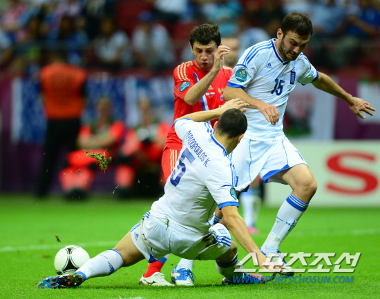 그리스가 러시아를 꺾고 극적으로 8강에 진출했다. 러시아와 그리스의 유로 2012 A조 조별예선 마지막 경기가 17일(한국시각) 폴란드 바르샤바 국립경기장에서 열렸다. 1-0으로 승리를 거두며 극적으로 8강에 진출했다. 반면 러시아는 8강 진출에 실패했다. 러시아 자고예프가 그리스 파파도풀로스와 토로시디스의 협공에 쩔쩔매고 있다.