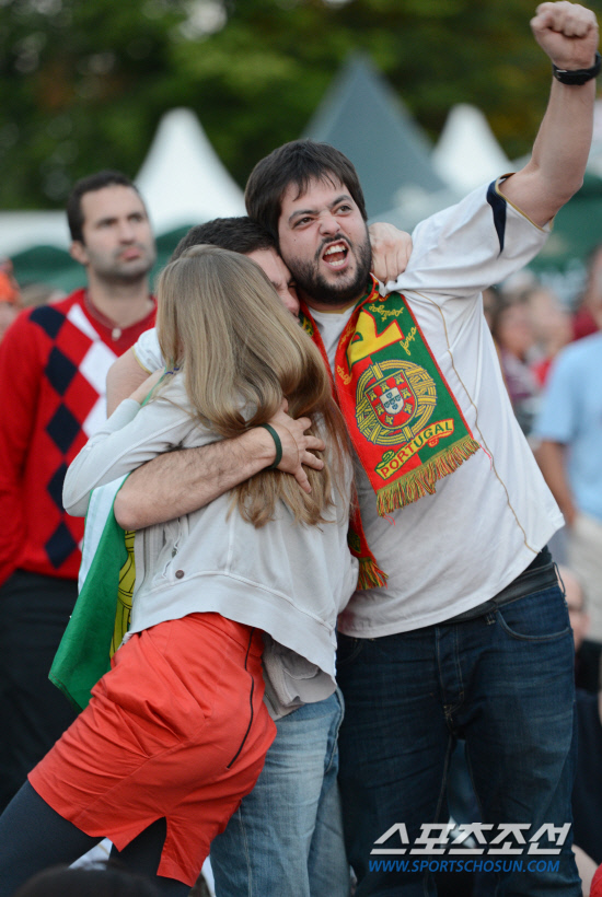 죽음의 조 4개국이 이웃나라 우크라이나에서 8강행을 향한 혈투를 벌인 가운데 폴란드 그단스크 광장에도 이들을 응원하는 팬들이 모여 열띤 응원전을 펼쳤다. 18일(한국시각) 유로 2012 B조 예선 최종전에서 포르투갈과 네덜란드, 독일과 덴마크가 맞붙었다. 폴란드의 유로 2012 개최도시인 그단스크 광장에도 이 경기를 함께 지켜보기 위해 많은 팬들이 운집했다. 포르투갈의 호날두가 2-1 역전골을 넣자 이를 지켜보던 포르투갈 팬들이 얼싸안으며 기뻐하고 있다.