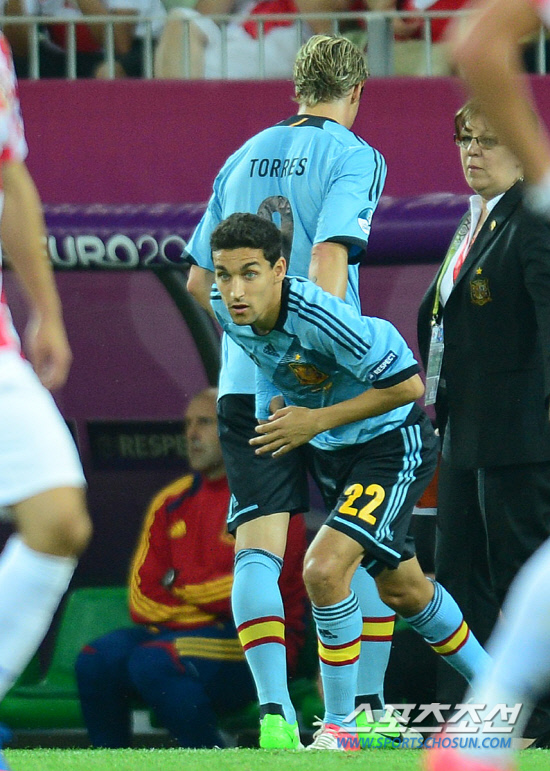 스페인이 교체멤버 나바스의 결승골로 크로아티아를 1-0으로 꺾고 조 1위로 8강에 진출했다. 스페인과 크로아티아의 유로 2012 C조 예선 마지막 경기가 19일(한국시각) 폴란드 그단스크 아레나에서 열렸다. 후반 스페인 토레스가 나바스와 교체되어 나오고 있다.