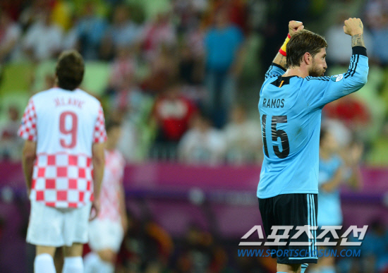 스페인이 교체멤버 나바스의 결승골로 크로아티아를 1-0으로 꺾고 조 1위로 8강에 진출했다. 스페인과 크로아티아의 유로 2012 C조 예선 마지막 경기가 19일(한국시각) 폴란드 그단스크 아레나에서 열렸다. 경기에 승리한 스페인 라모스가 기뻐하고 있다.
