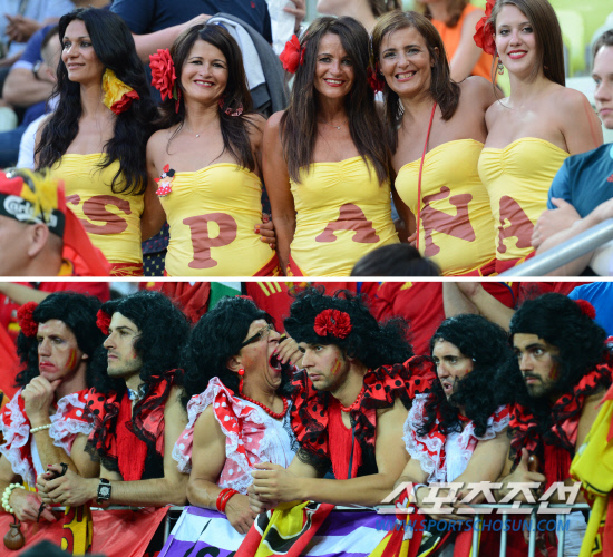 스페인과 크로아티아의 유로 2012 C조 예선 마지막 경기가 19일(한국시각) 폴란드 그단스크 아레나에서 열린 가운데 경기장을 찾은 중년의 스페인 여성들이 튜브톱 의상으로 멋을 냈다. 또다른 곳에서는 여장을 중년 남성들이 경기가 잘 풀리지 않자 심각한 표정으로 운동장을 바라보고 있다.