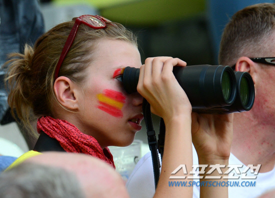 스페인과 크로아티아의 유로 2012 C조 예선 마지막 경기가 19일(한국시각) 폴란드 그단스크 아레나에서 열린 가운데 한 스페인 응원 여성이 쌍안경으로 선수들의 모습을 지켜보고 있다.