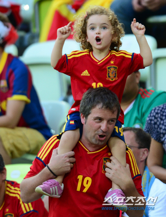 스페인과 크로아티아의 유로 2012 C조 예선 마지막 경기가 19일(한국시각) 폴란드 그단스크 아레나에서 열린 가운데 한 소녀가 아빠의 무등을 탄 채 즐거워하고 있다.