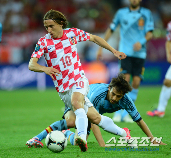 크로아티아 모드리치가 19일(한국시각) 스페인과의 유로2012 C조 예선 최종전에서 실바를 제치고 돌파하고 있다. 그단스크(폴란드)=정재근 기자 cjg@sportschosun.com