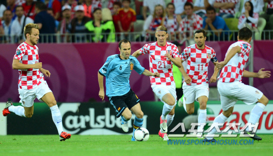 크로아티아 선수들이 스페인 미드필더 안드레스 이니에스타(왼쪽에서 두 번째)를 둘러싸며 강하게 압박하고 있다. 그단스크(폴란드)=정재근 기자 cjg@sportschosun.com